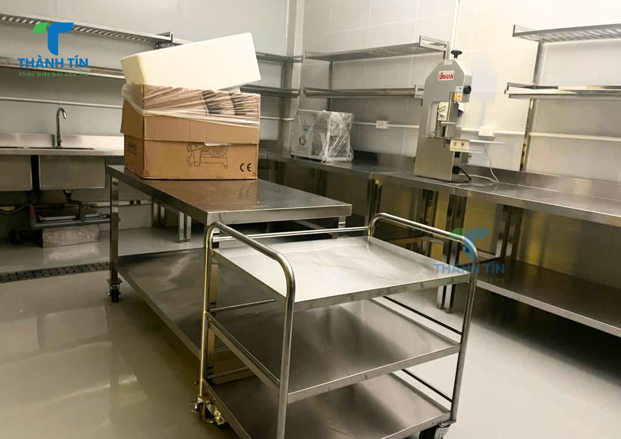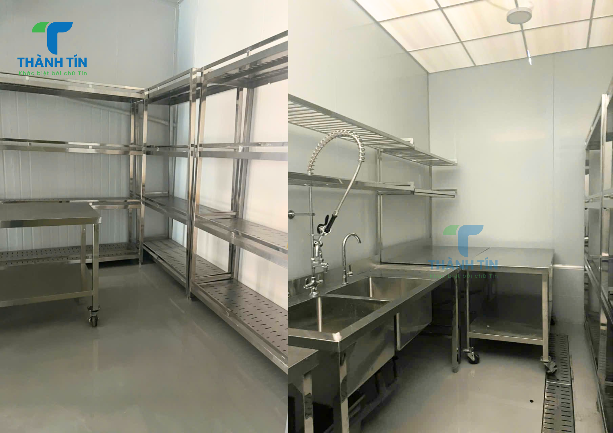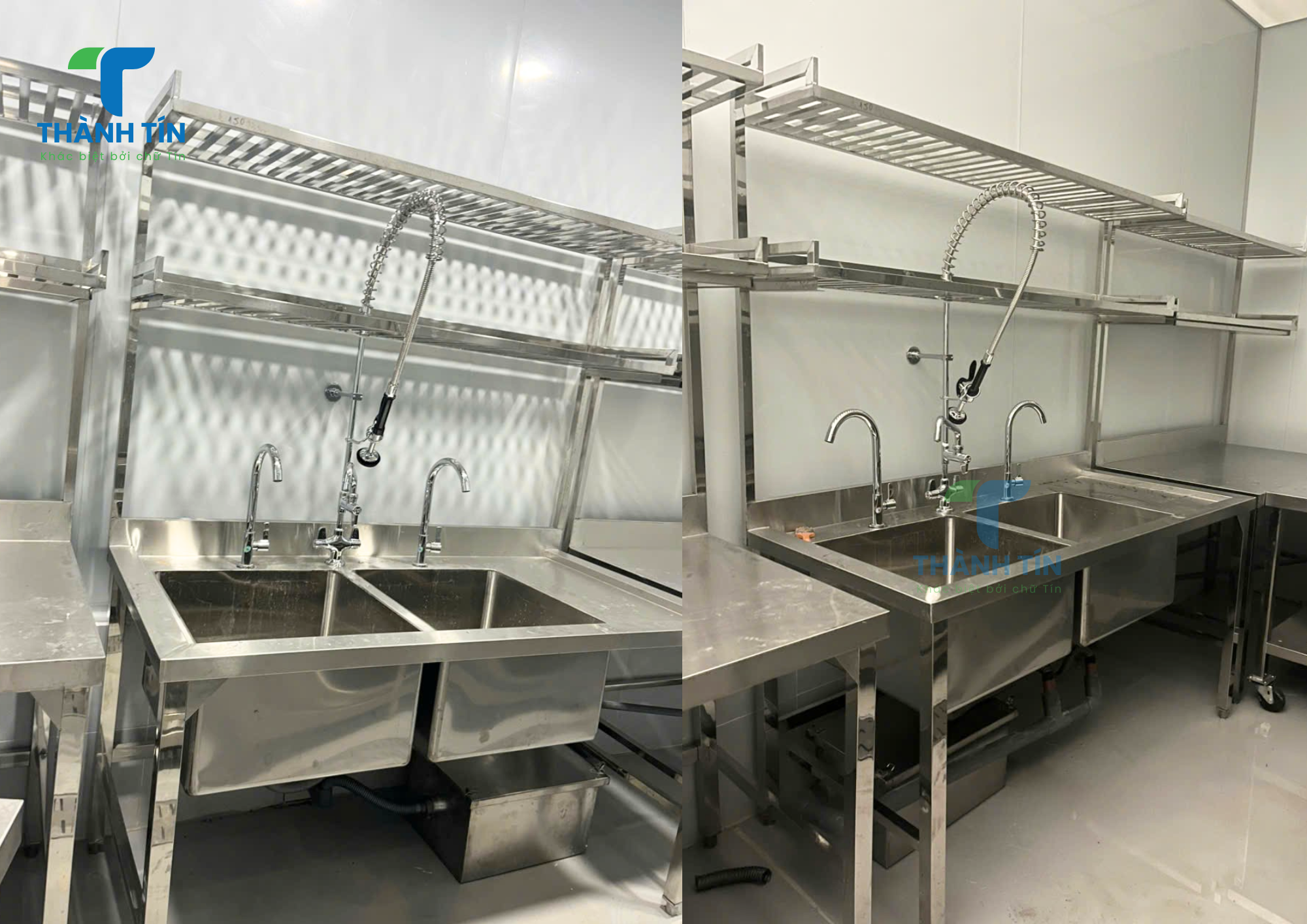 Dựa trên khảo sát thực tế và yêu cầu vận hành của Siba Food, Thành Tín đã tư vấn và cung cấp giải pháp thiết bị inox đồng bộ, phù hợp với mô hình bếp trung tâm hiện đại: